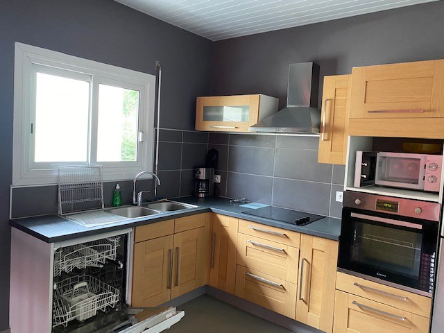 Cuisine équipée ouverte sur le séjour, deux chambres climatisées avec placards et une salle de bain avec WC.