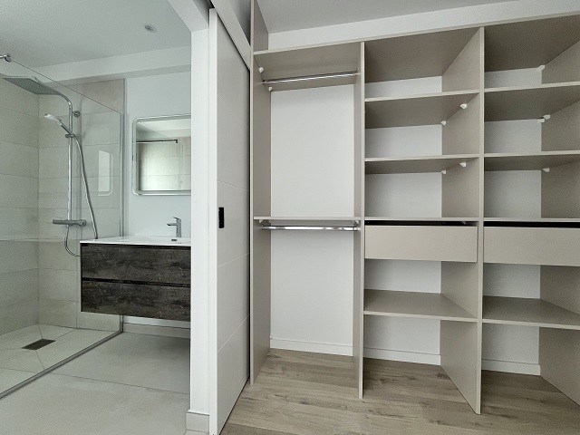 Une chambre parentale climatisée avec dressing et salle d’eau, deux chambres climatisées avec placards, une salle d’eau et un wc.
