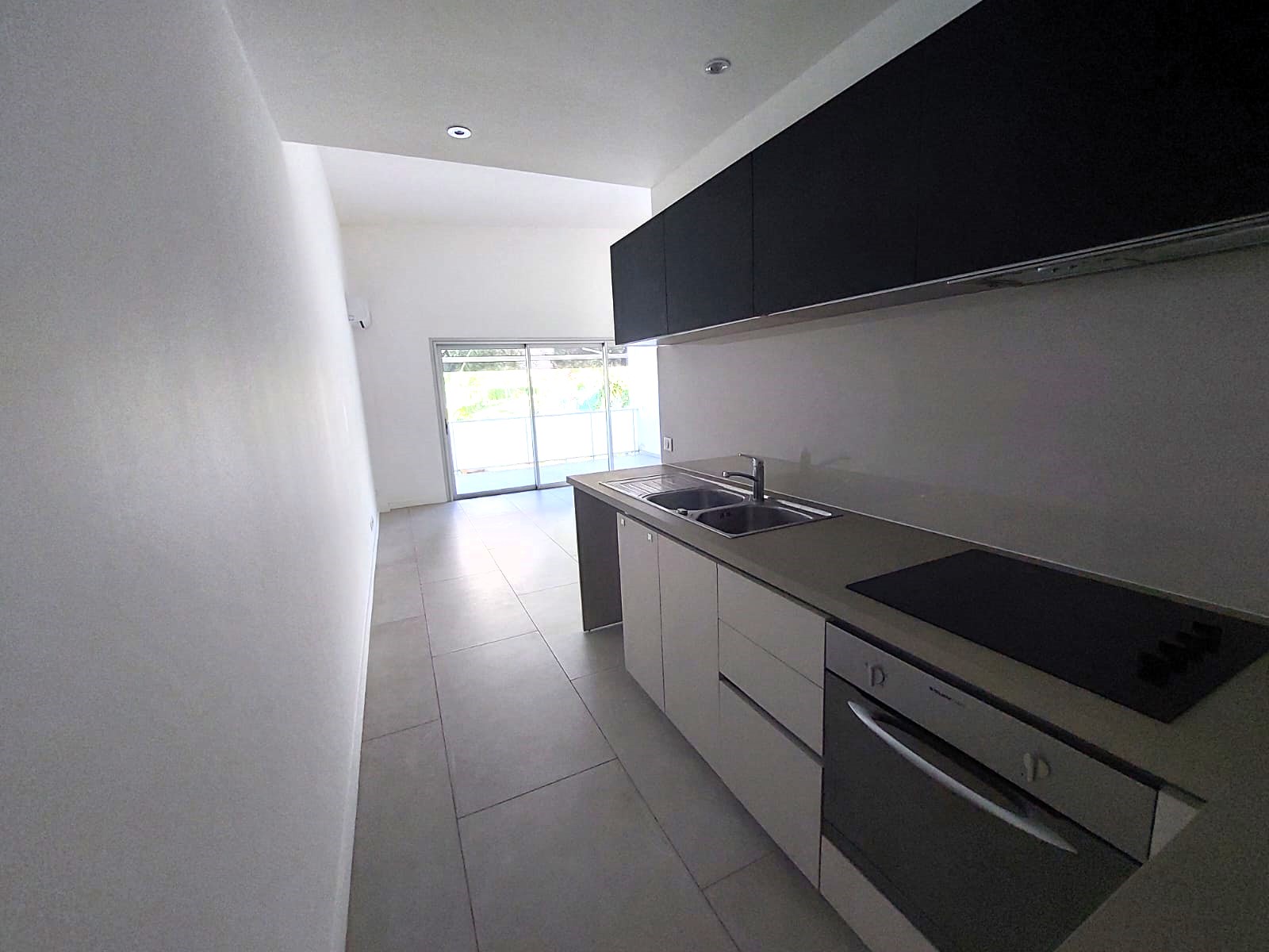 Une pièce à vivre climatisée avec cuisine aménagée et équipée avec une belle hauteur sous plafond.